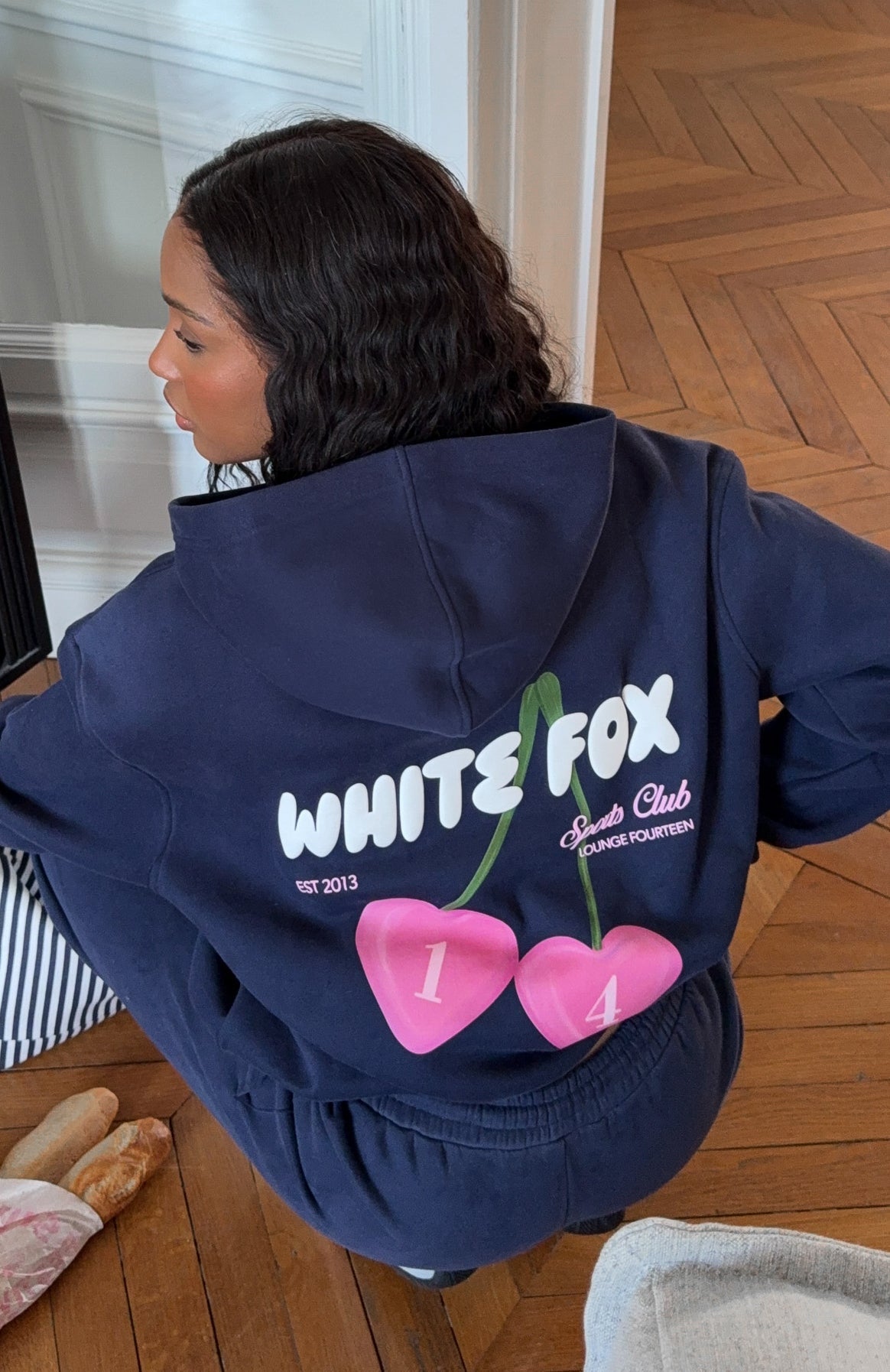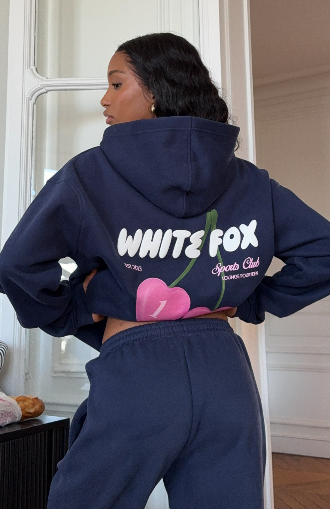 Cozy mornings call for the Club 14 Trinity Oversized Hoodie Navy! Designed with a relaxed hood, slouched shoulders and ribbed hems which round out an oversized silhouette. Featuring long sleeves, a roomy front pocket, and an unlined fleece interior, this hoodie delivers a cozy feel. Finished with puff print White Fox text paired with cherry graphic side front and centre back. Style with the matching Club 14 Trinity Sweatpants for a look we love.